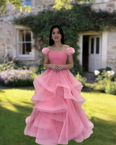 Pink Ruffle Ball Gown Off Shoulder Dress